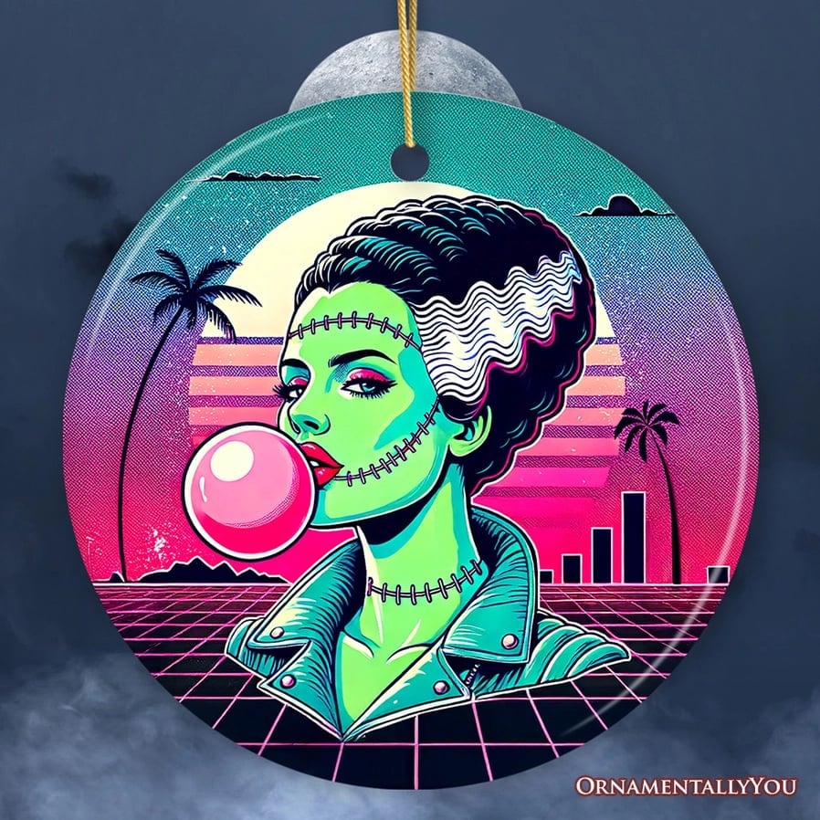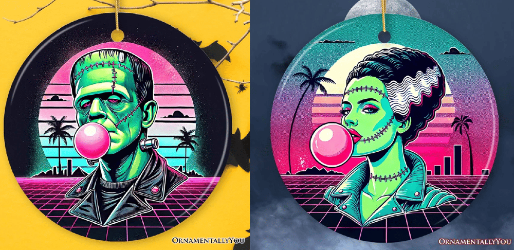 These awesome ceramic decorations feature an 80's synth wave Frankenstein's Monster and The Bride, They measure approx 3" Come with a gold tie string and in a velvet pouch